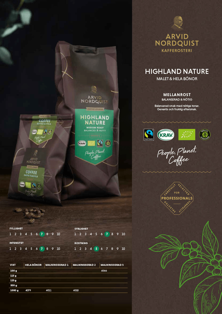 ”Allt vårt kaffe kommer från hållbart certifierade kaffeodlare som garanterar odling med hänsyn till människa och miljö. Dessutom klimatkompenserar vi för den påverkan som fortfarande återstår. Så oavsett vilken av våra kaffesorter du väljer så bidrar vi till en minskad påverkan på människa och miljö. Ditt val gör skillnad!'