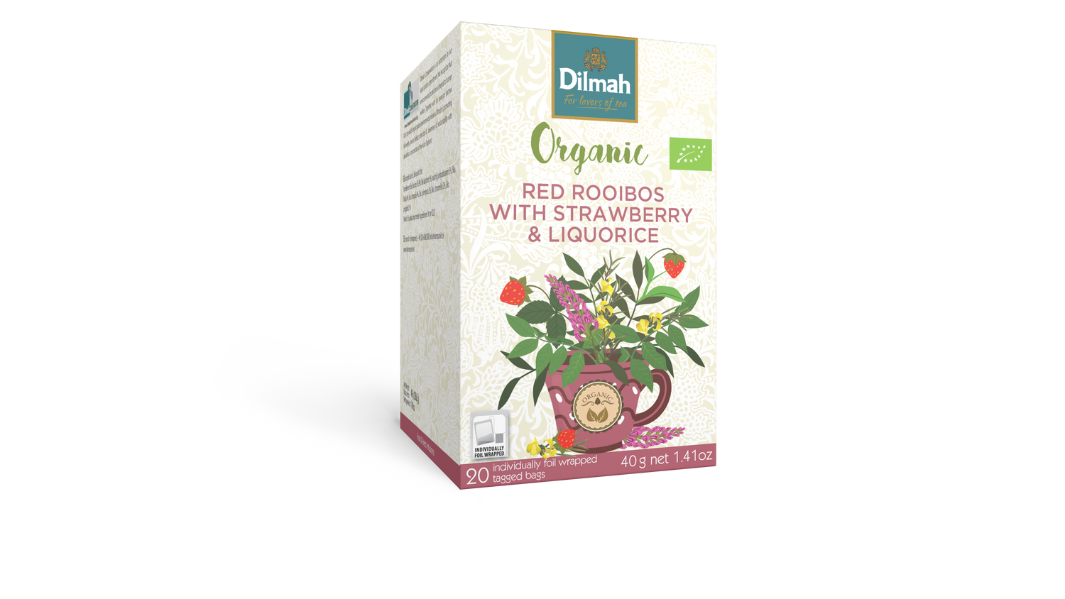 Ekologiskt rooibos med fräsch och tydlig jordgubbs- och lakritssmak och en antydan av mynta. Koffeinfritt.
