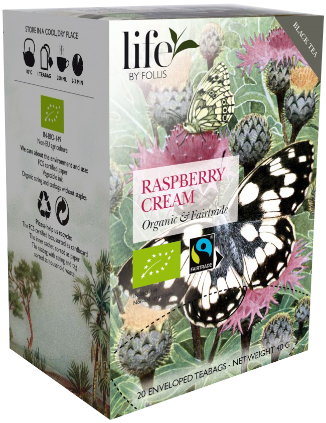 | Innehållsförteckning | Ingredienser: Ekologiskt svart single estate te med bitar av hallon och gräddsmak. |