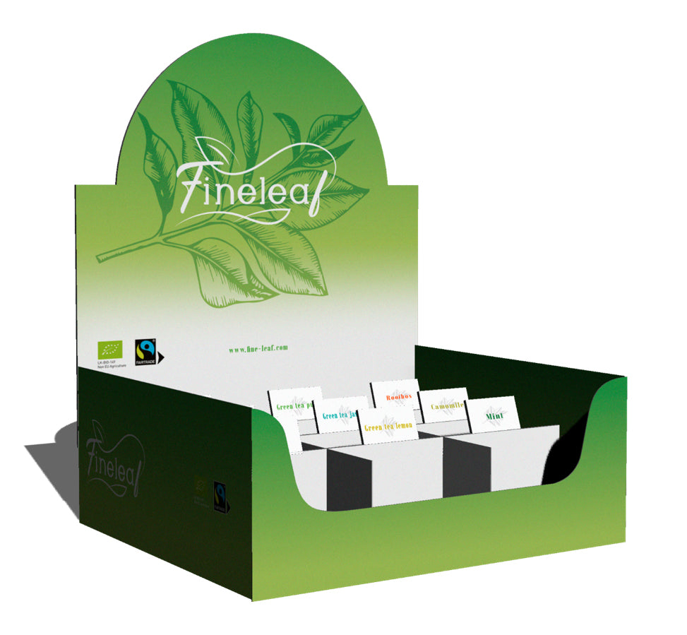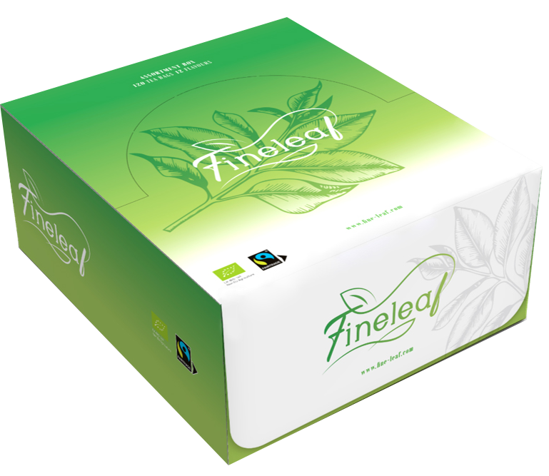 Fineleaf sortmentbox 12 smaker x 10 teabags: English Breakfast, Earl Grey, Forest Fruit, Green tea, green tea Lemon, Green tea Ginger Lemon, Green tea Mint, Green tea jasmin, Rooibos, Rooibos Vanilla Orange, Camomile, White tea raspberry.