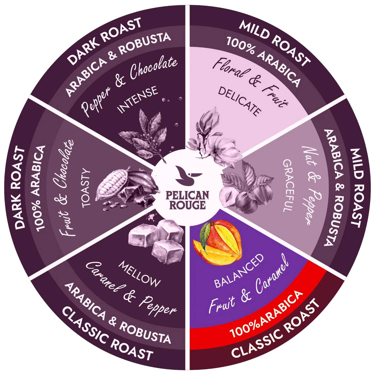 Rundat och aromatiskt kaffe, med en krämig munkänsla och toner av karamell.